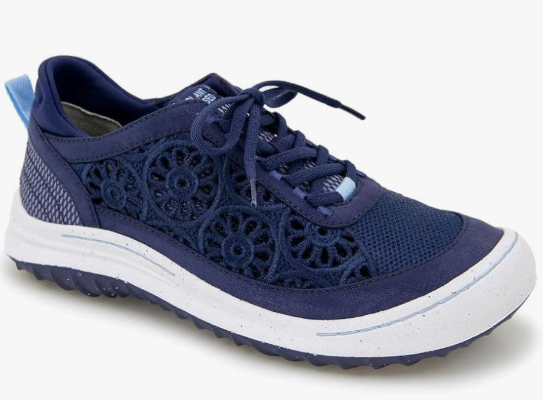 A flirty sneaker with rugged appeal. The Solar is an ideal match for the adventurer with a sweet side, pairing a durable All Terra traction outsole with a mixed material upper of fabric, mesh, neoprene, and satin flyknit, accented with floral perforations. A traditional lace-up closure allows you to secure the shoe to your liking, and memory foam insoles cushion every step.